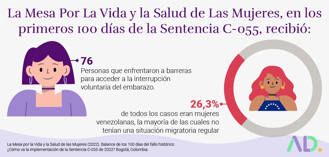 Aunque Colombia despenalizó el aborto, las mujeres y las niñas tienen dificultades para acceder a los servicios de aborto. Por ejemplo, La Mesa Por La Vida y la Salud de Las Mujeres recibió muchos casos en los primeros 100 días de la Sentencia C-055. Un número considerable de las personas que atendieron eran mujeres venezolanas, la mayoría de las cuales no tienen una situación migratoria regular 2.